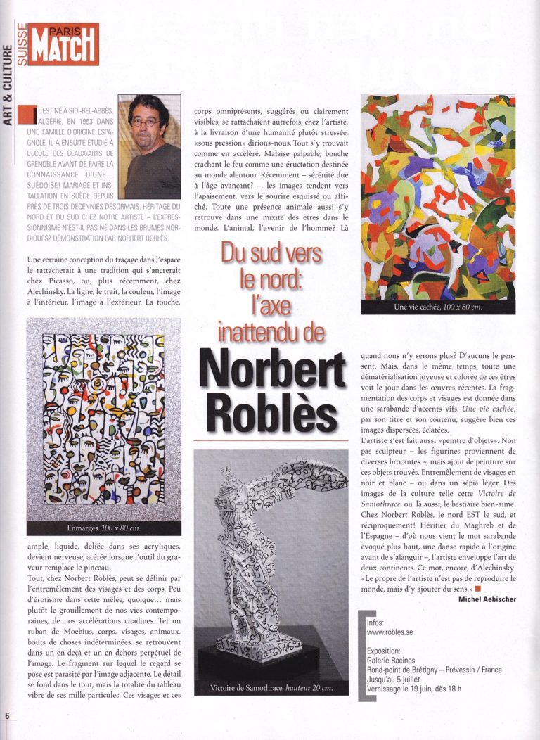 Ansiktsmasker är ett centralt inslag i Norbert Roblès’ bildvärld. Från färgintensiva, detaljerade studier av rollspelen i commedia dell’arte till avskalade afrikanska ritmasker. Själv säger han att det är länderna kring Medelhavet som präglat och inspirerat honom allra mest. Sydeuropa, främre Orienten. Härifrån kommer stämningen och formerna, den varma färgpaletten.